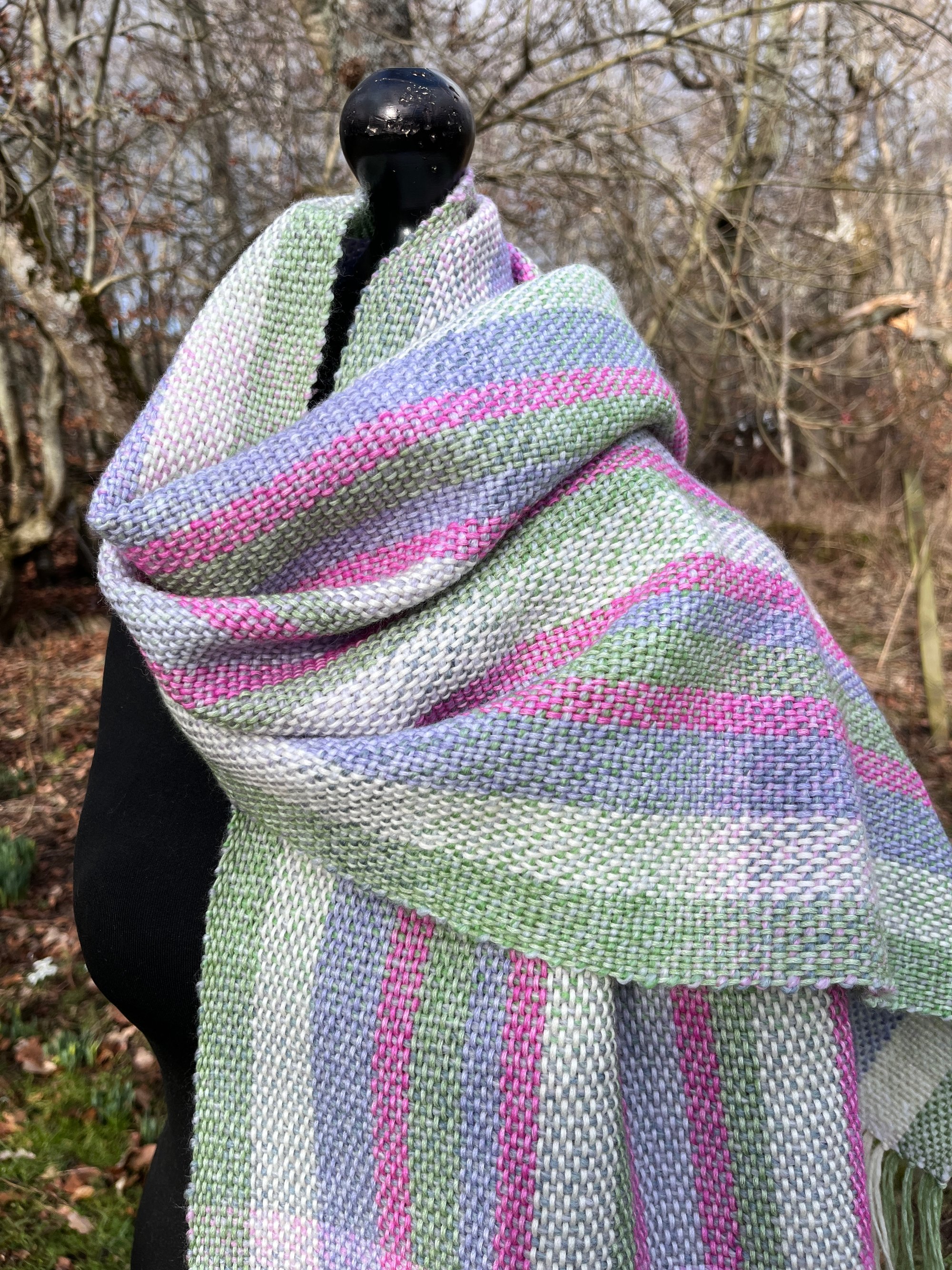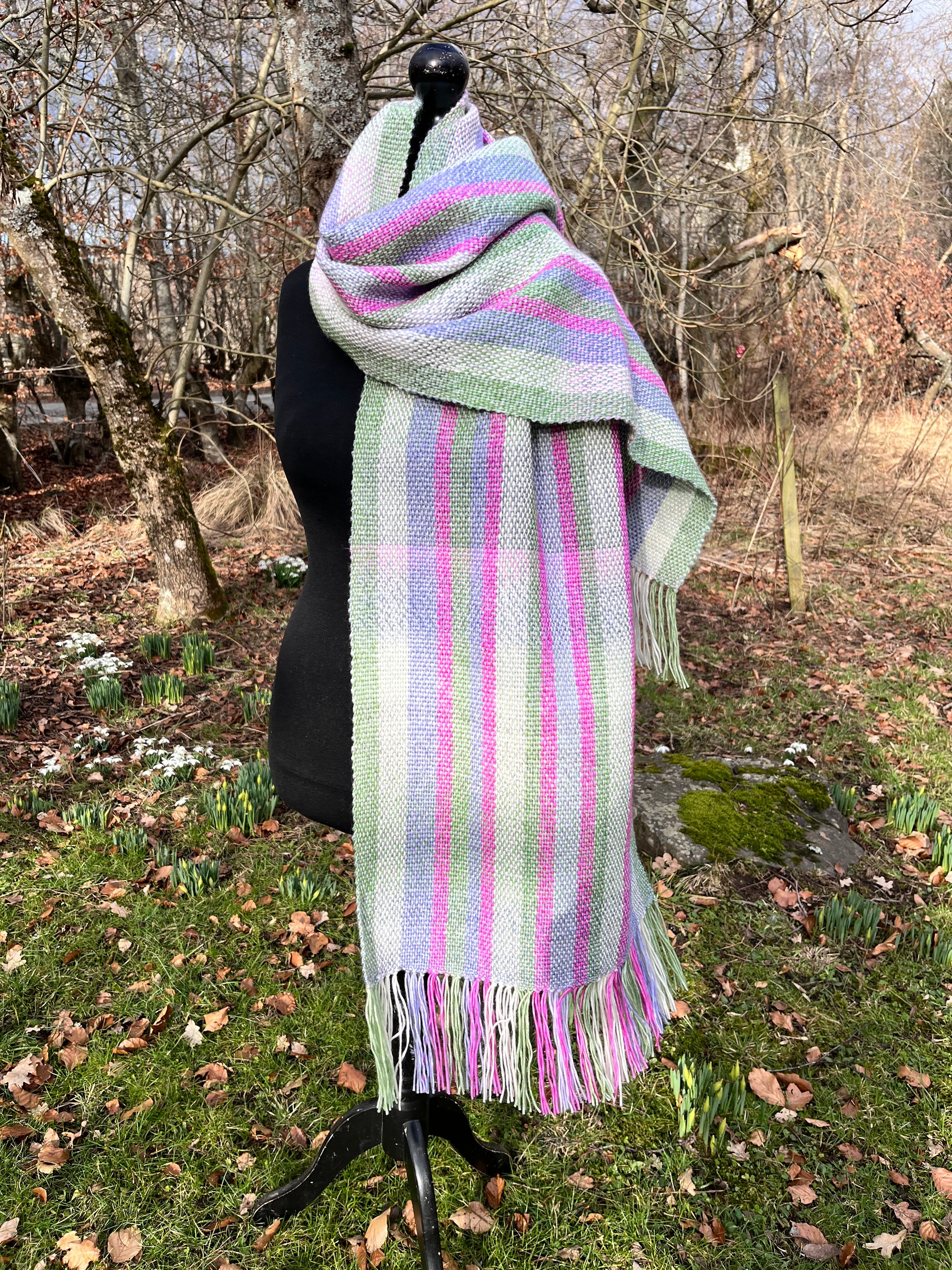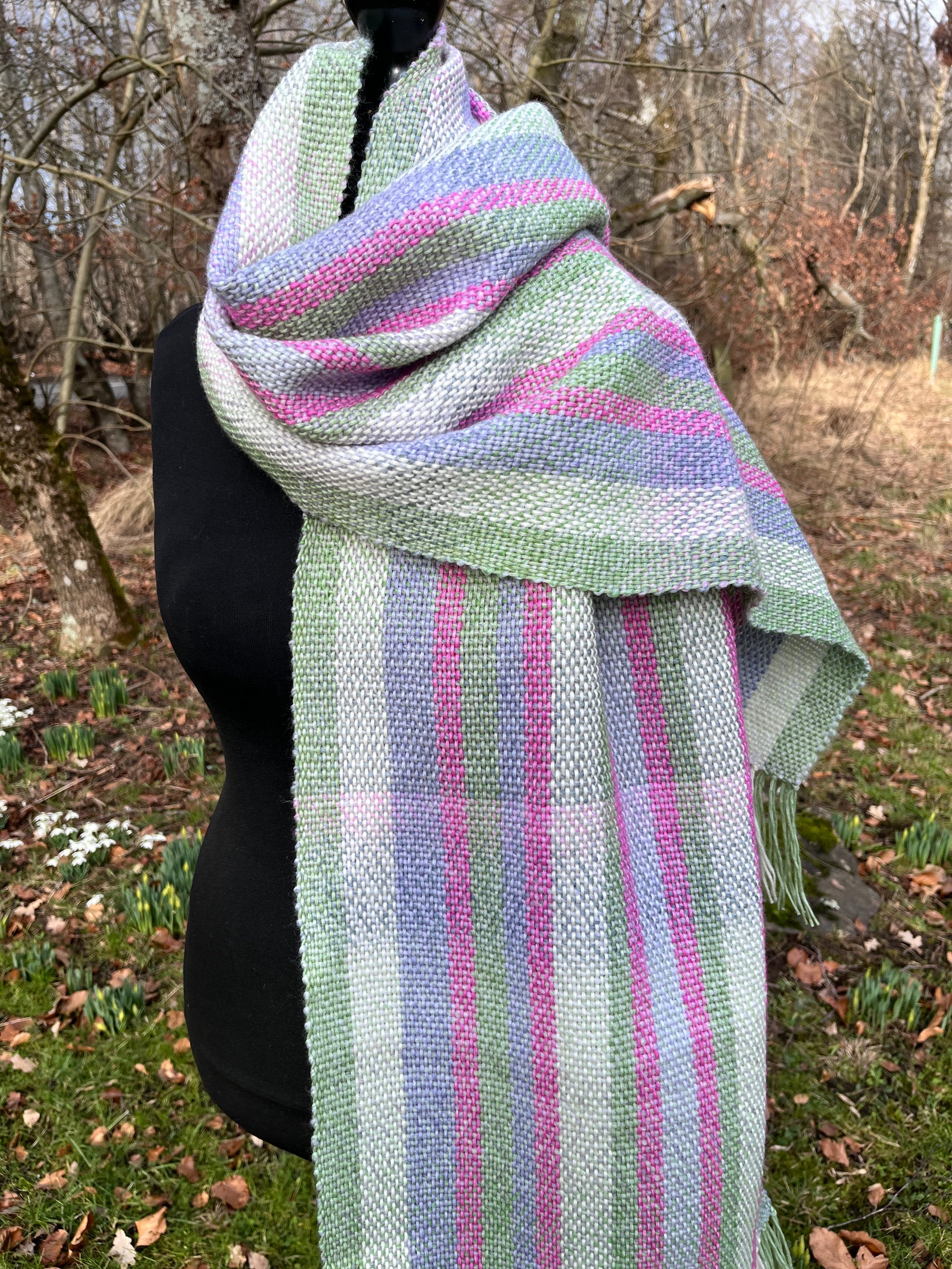 A handwoven scarf inspired by the signs of spring peeking though after a long winter.